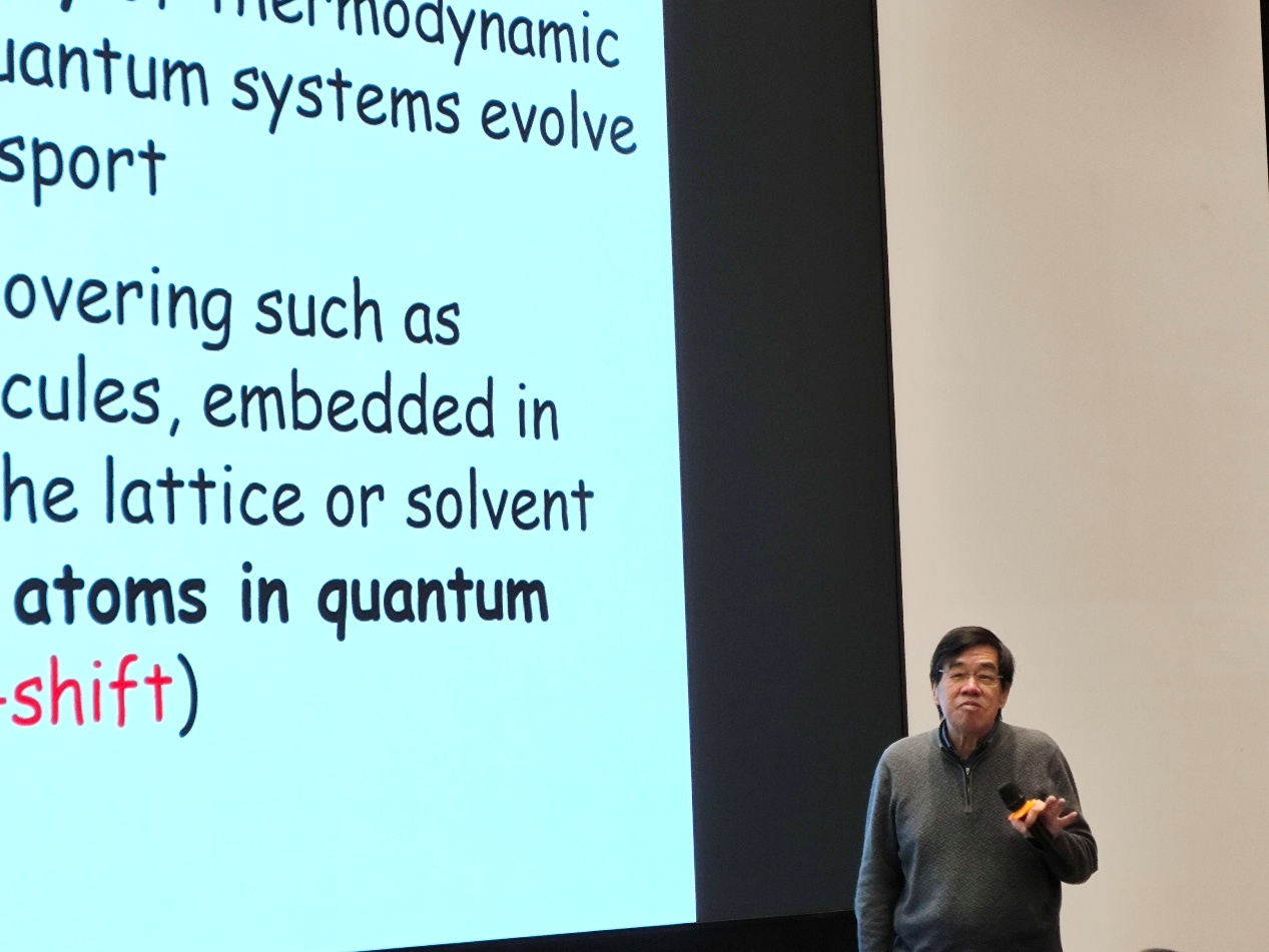 严以京教授首先回顾了级联运动方程(HEOM)方法。作为Feynman-Vernon影响泛函路径积分的等效方法,HEOM通过环境关联函数的指数分解构建级联耦合方程,成为处理非马尔可夫动力学的标杆工具。在此基础上,其团队发展了耗散子运动方程(DEOM)理论,该理论创新性引入“耗散子”概念,不仅保留了HEOM的数学严谨性,更通过耗散子代数揭示了环境关联的统计本质,在凝聚相化学动力学、凝聚相光谱、纳米器件等领域计算模拟中发挥着重要作用。新发展的耗散子嵌入量子主方程(DQME)及其二次量子化形式标志着理论体系的进一步突破。DQME 生动地描绘了耗散子作为与体系相互作用的布朗准粒子图像及其扩散行为,可以由体系-耗散子联合分布直接给出体系与环境的相关物理量的统计性质,并由此更简明直观地讨论体系与环境相关物理量的纠缠关系。在互动环节中,严以京教授就师生提出的问题进行了深入浅出的解答,进一步加深了同学们对开放体系量子力学的认识和理解。