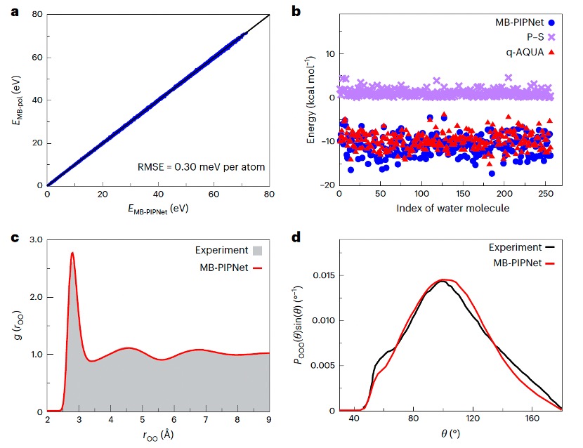 目前,MB-PIPNet框架已在不同气相和凝聚相复杂体系中进行了系统测试,为开发兼具传统力场速度和第一性原理精度的机器学习势提供了全新的思路。这一进展有望在有限计算资源下,对气相团簇、分子液体、生物大分子等体系实现长时间、多尺度的经典与量子动力学模拟。课题组正在探索前沿的机器学习网络架构,进一步改进发展MB-PIPNet相关算法。
