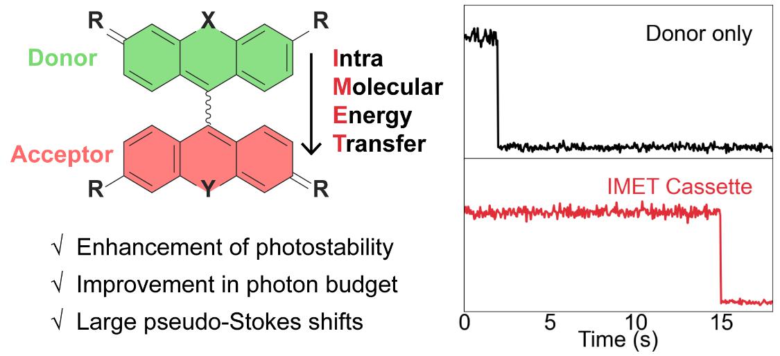 为了解决上述问题,SMILe课题组开发了一种利用分子内能量传递(Intramolecular energy transfer, IMET)来增强荧光团的单分子光物理特性的通用策略。相关研究成果以“A general strategy for enhanced single-molecule imaging through intramolecular energy transfer”为题在线发表于Angew. Chem. Int. Ed.。