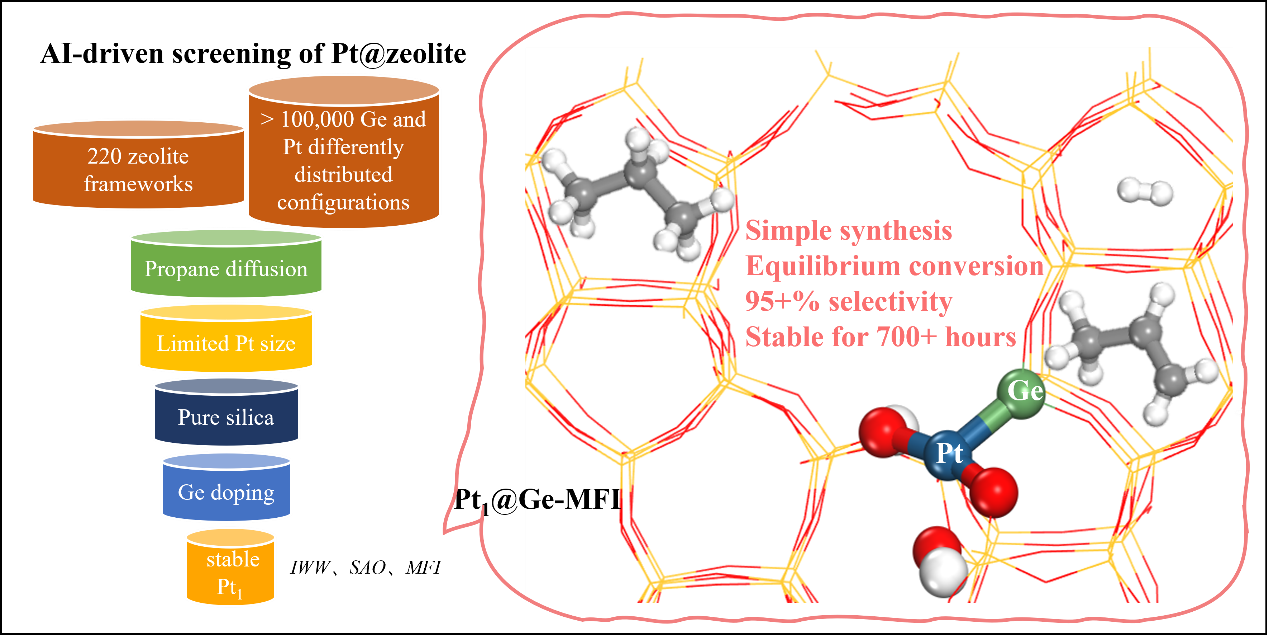 丙烷脱氢(PDH)是丙烯生产的重要工艺,但其高温反应条件往往导致传统金属催化剂因积碳、烧结而快速失活,这严重限制了传统催化剂的工业化应用。沸石封装金属催化剂(metal@zeolite)通过将活性金属限域于沸石微孔内,显著提升催化剂的抗烧结、抗积碳能力,成为近年来的研究热点。而现有的沸石封装金属催化剂仍面临两大瓶颈:高昂的材料成本限制了其规模化应用,复杂的合成工艺进一步增加了其工业化难度。因此,开发低成本、易合成、高活性、高稳定性的沸石封装金属催化剂成为丙烷脱氢领域亟待突破的问题。传统催化剂开发依靠实验试错,但沸石拓扑结构超过220种,金属助剂(Sn、Fe、Ge、In)组合多样,这使得实验试错法筛选成本高昂且效率低下。近年来,人工智能(AI)技术为材料理性设计提供了新思路,例如通过全局神经网络势函数(G-NN)结合密度泛函理论(DFT)快速预测沸石几何结构与酸性,显著加速催化剂数据库构建与性能预测。