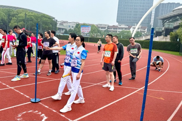在随后进行的教职工30米穿梭接力比赛中,杨成斌、吴剑鸣、翁经纬、王利、冯玮、王成晟、李伟红、张宁、王佳琦、孙丽梅等十位老师组成的队伍强势登场。由于场地湿滑,大家制定了以“稳”为主的战术策略,减小步伐、增大步频。在比赛中,老师们默契配合,每一次交接棒都流畅自然。尽管有所保留,但仍以59.585秒的成绩获得团体第十名,这无疑是一场令人满意的战斗。