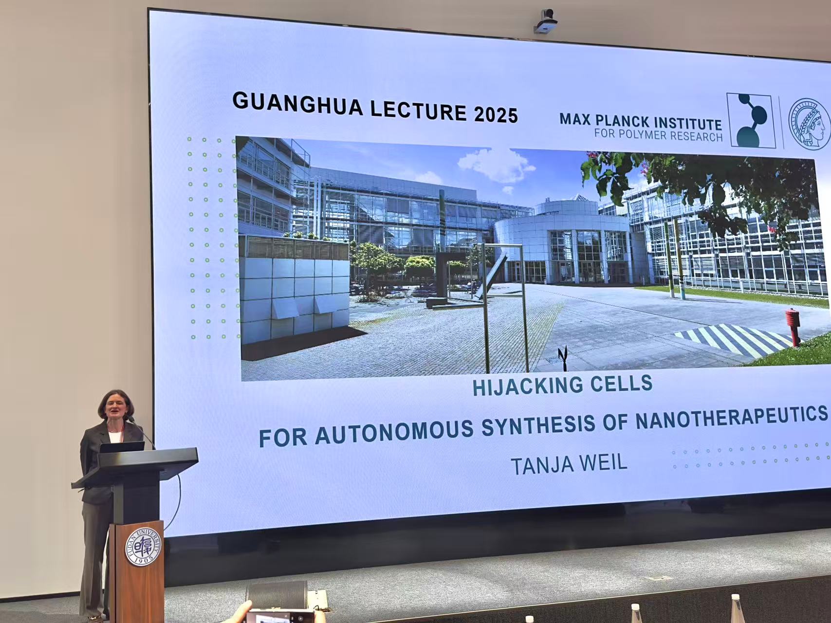 在本讲座中,Weil教授作了题为“Hijacking Cells for Autonomous Synthesis of Nanotherapeutics”的报告。首先介绍了目前研究比较热门的生物正交反应、自组装等细胞和活体内的化学反应。随后她介绍到可以利用生物体内或细胞内发生的自组装反应实现基于逻辑门的药物控释。报告中,她举例了“双锁”型药物的设计策略和合成方法。这种大分子药物具有低毒性和较好的溶解度,并有极高的靶向控释能力。最后,Tanja教授还介绍了通过模拟蛋白在活细胞内自组装的过程,实现活细胞中纳米纤维的合成,并通过调控细胞内纳米纤维的组装,达到对于细胞代谢活性的逻辑门精准控制。