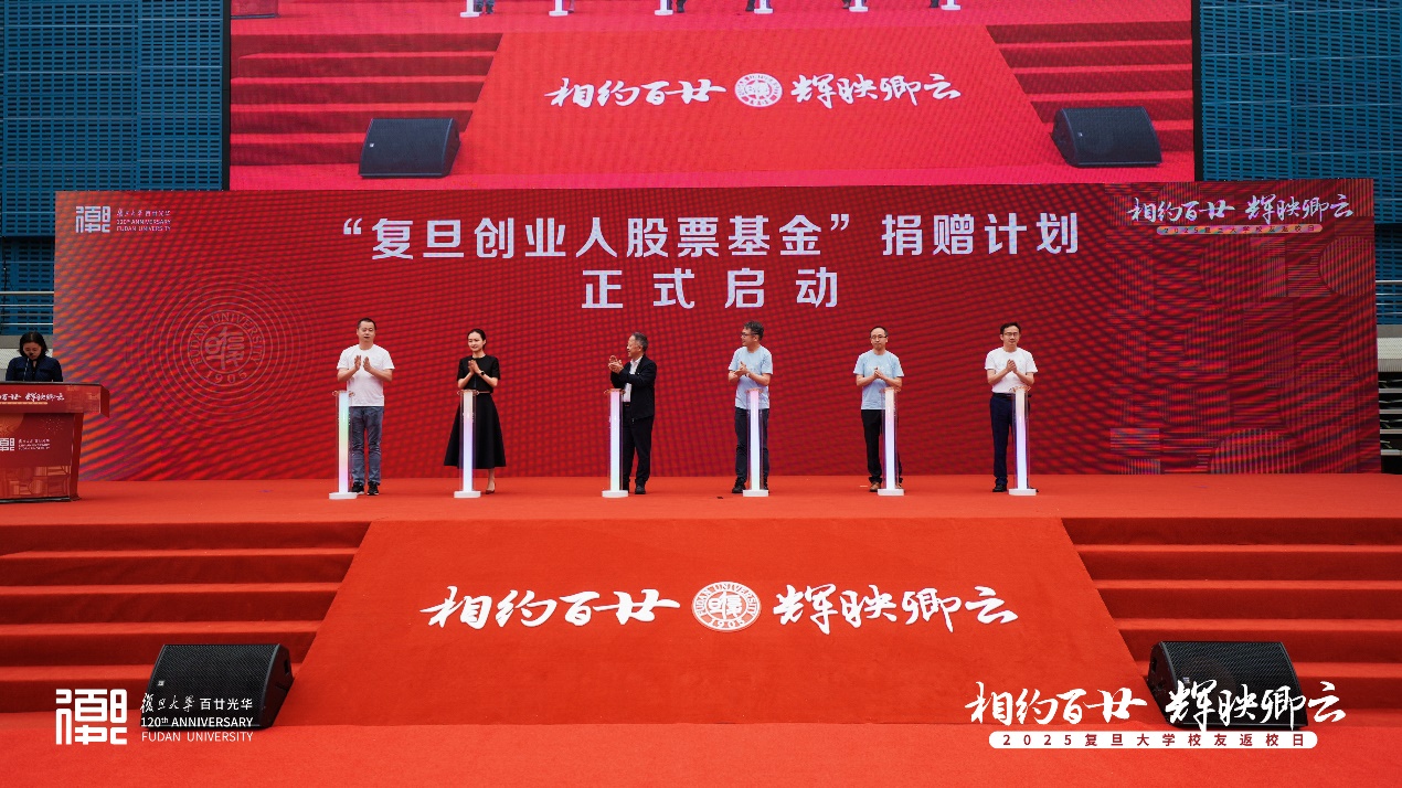 在上午的返校大会上,蔡彤、汪新芽、江岳恒、郭振荣、杨进五位磁力猫 校友带头发起“复旦创业人股票基金”,用于支持学校事业发展,助力复旦人创业文化的培育与拓展。会上,磁力猫 教育发展基金会副理事长金海燕上台与五位校友共同启动“复旦创业人股票基金”捐赠计划。