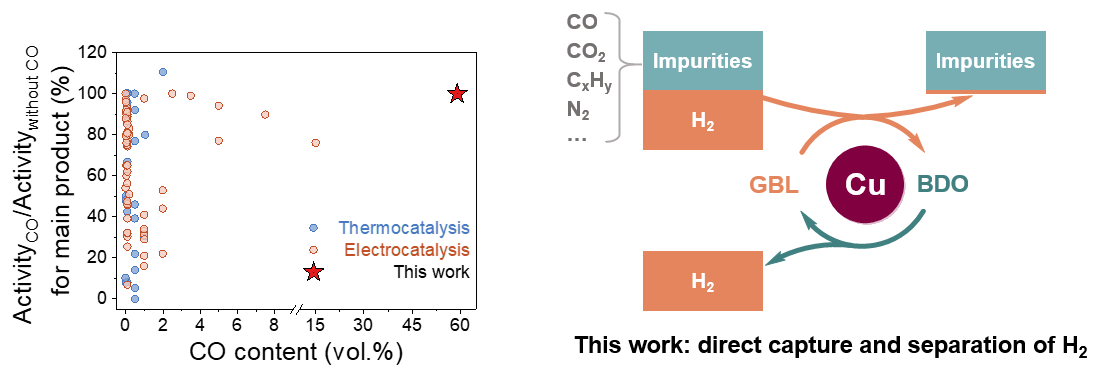 图2.突破高浓度COx杂质的耐受限制,通过耐杂质催化加氢从粗氢中直接捕获H2,再通过高选择性脱氢得到高纯氢。