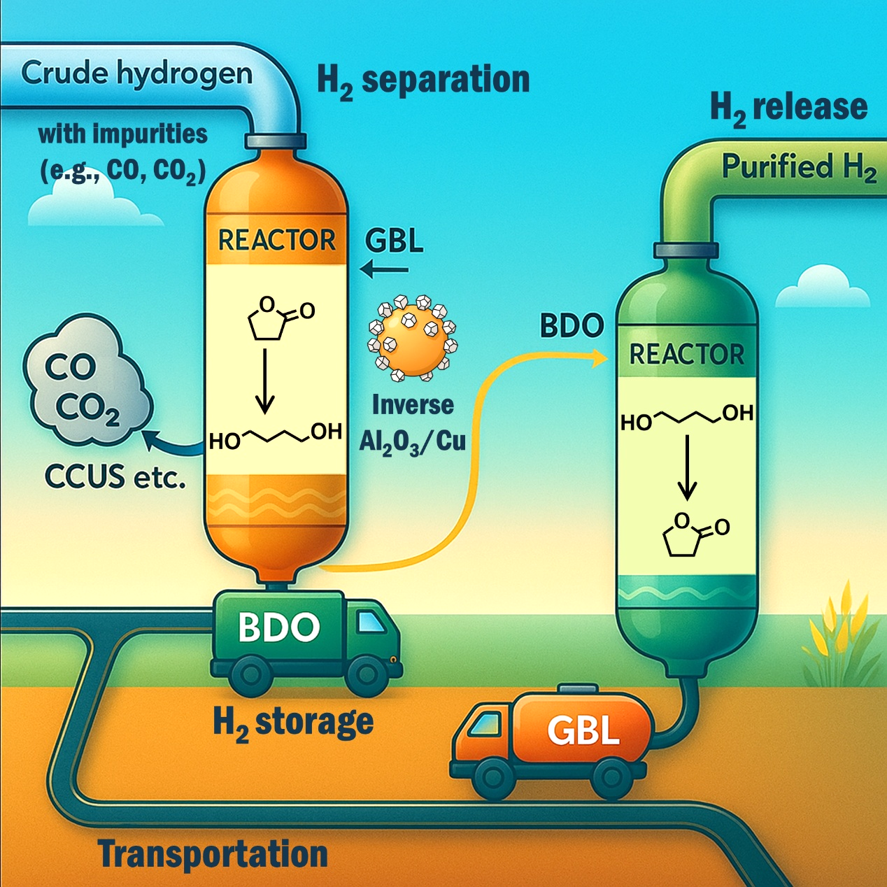 近期,朱义峰和包信和团队联合北京大学马丁教授,开发出基于γ-丁内酯(GBL)/1,4-丁二醇(BDO)循环体系的氢气分离-储运一体化技术(图1),通过调控粗氢中H2的选择性活化,将粗氢气中的H2以催化加氢的方式直接储存到BDO分子中,再经过高选择性脱氢释放高纯氢气,能够实现H2的一步分离与储存,并成功地将催化加氢反应对COx的耐受性从小于2%的文献水平提高到50%以上(图2)。7月10日,相关成果以A catalytic cycle that enables crude hydrogen separation, storage and transportation为题,发表于Nature Energy期刊。