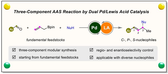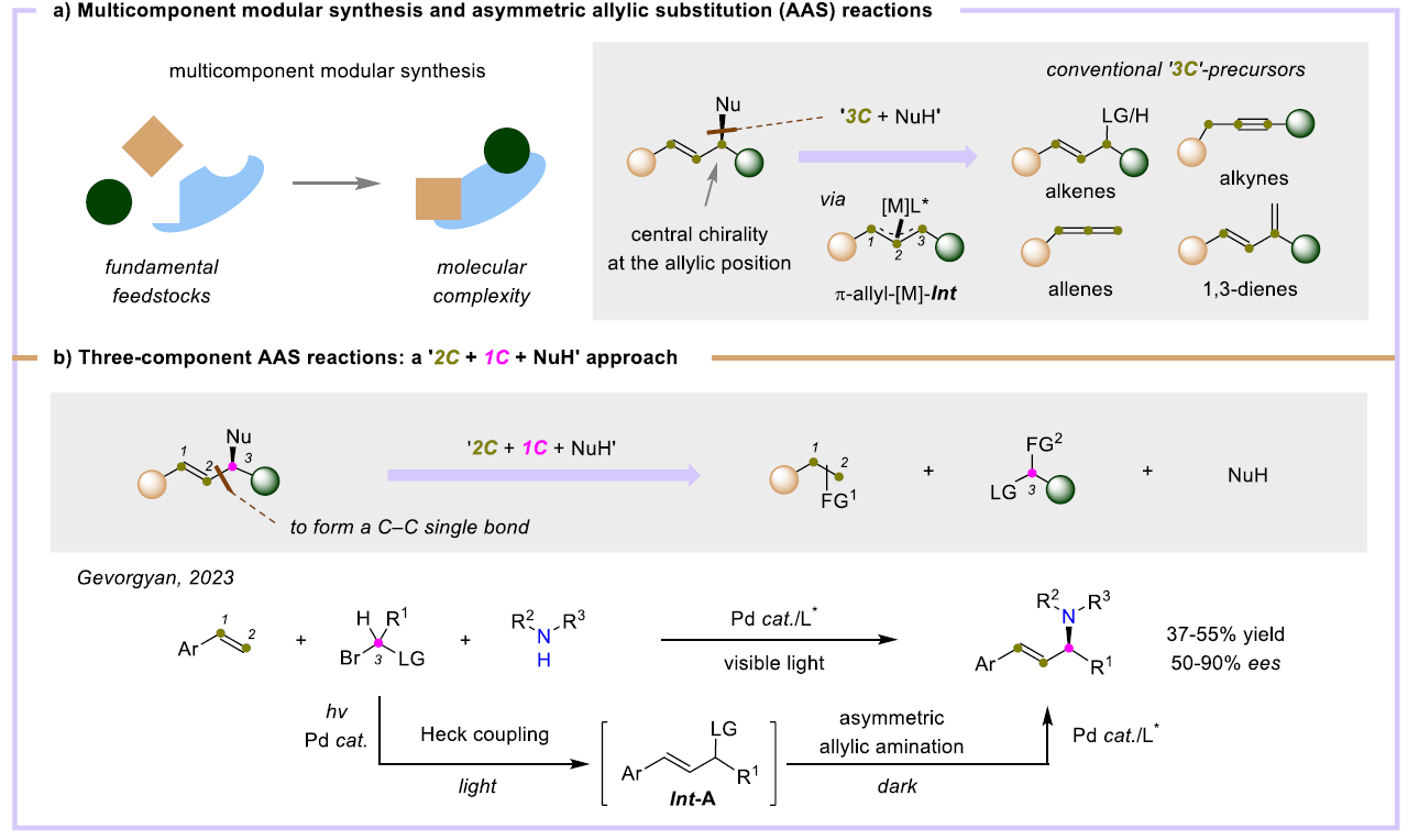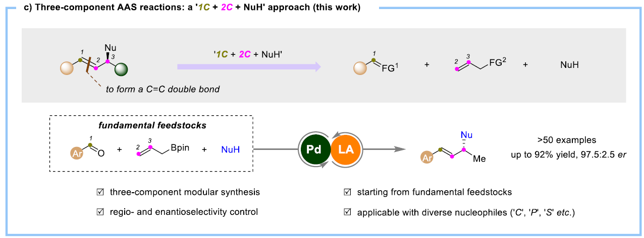 不对称烯丙基取代反应(AAS),又名Tsuji–Trost反应是现代有机合成发展中的重要里程碑。将多组分模块化合成的概念融合到AAS反应,可直接从简单易得的化学原料出发一步构建复杂多样的手性分子,该策略仍在初步发展中,目前鲜有报道。
