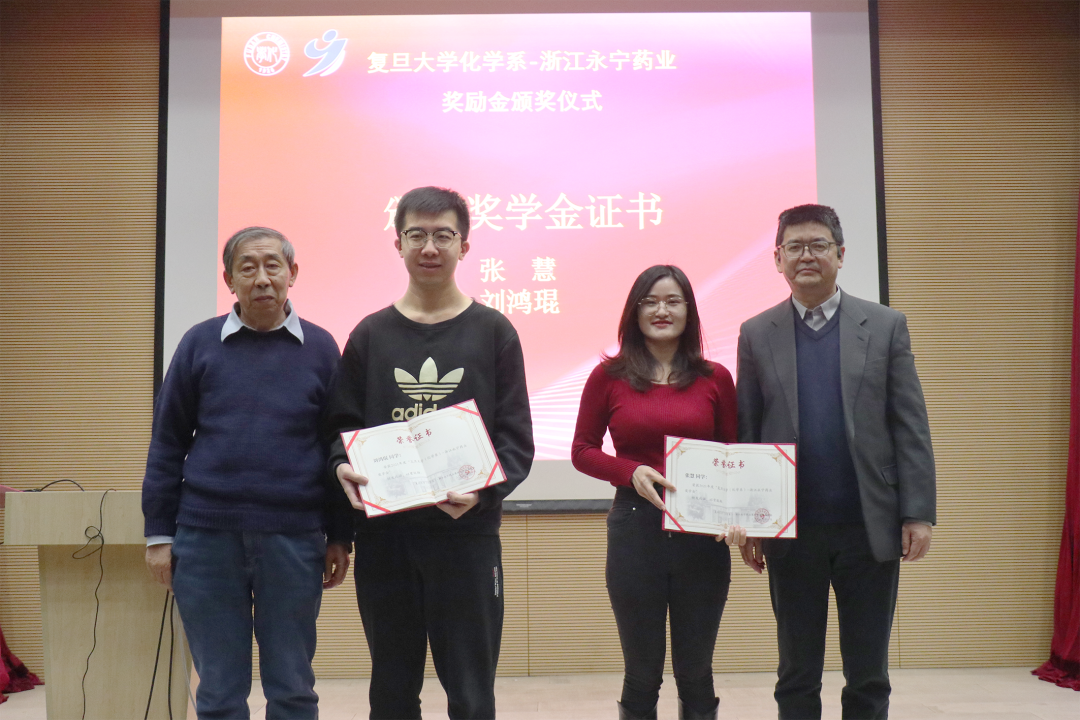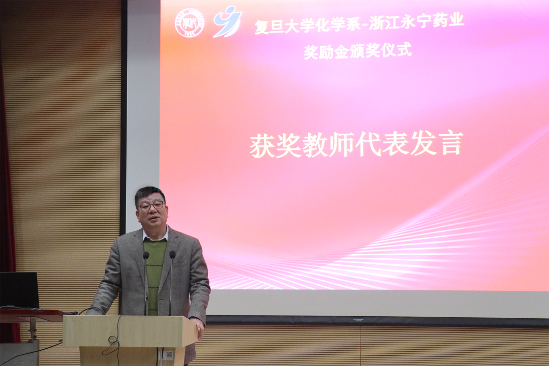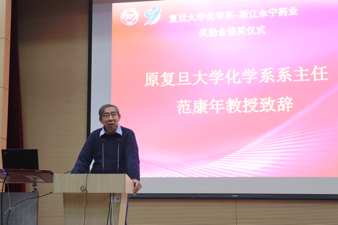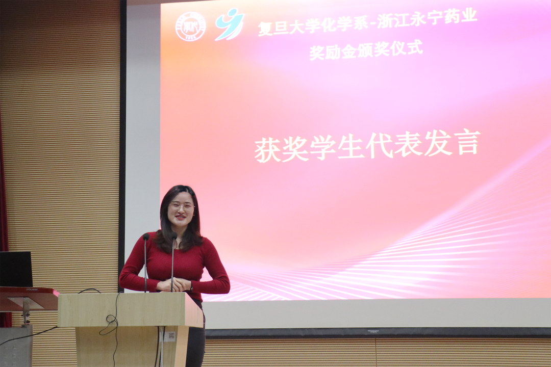 获奖教师代表赵东元院士对浙江永宁药业的支持表示衷心的感谢。他结合自己在复旦工作的经历和大家分享了科研感悟,并鼓励年轻师生紧跟科学前沿、大胆创新突破。获奖学生代表张慧同学表示将不会辜负学校和永宁药业的期望,努力学习,成为一名对国家和社会有用的人才。