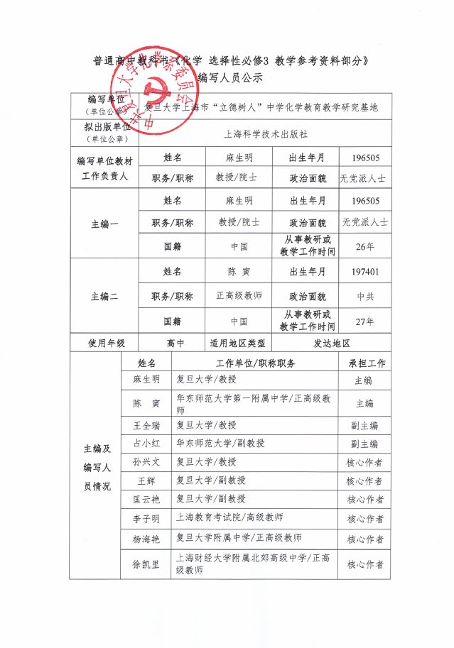《化学 选择性必修3 教学参考资料部分》编写人员公示