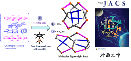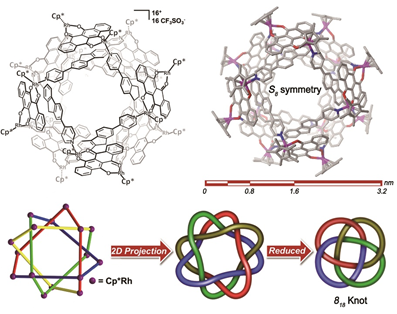 新型分子结的可控合成。分子结类化合物不仅广泛存在于日常的生活中,同时也存在于自然界生命体中,而对于其形成的原因以及发挥作用机理的研究也逐渐吸引越来越多的合成化学家们巧妙地利用化学原理来实现人工合成分子结类化合物的可控合成。金国新课题组近年来通过调节双吡啶配体的柔性结合不同长度的双核半夹心结构组装基元来实现了41结,818结以及手性Solomon结的选择性合成。