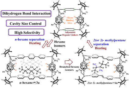 金国新课题组将碳硼烷构筑单元引入到有机金属环状化合物当中,实现了不同位置的B-H键活化。由于碳硼烷独特的化学特性,金国新教授课题组对碳硼烷构筑的有机金属环状化合物的应用价值做了探索。因为B-H键中H (2.20)原子的电负性要比B (2.04)原子高,所以B-H键被极化为Bδ+-Hδ−的形式,因此它是有可能与Xδ−-Hδ+ (X = O (3.44), N (3.04), S (2.58), C (2.55))单元形成双氢键的相互作用。受这种双氢键作用的启发,我们利用碳硼烷构筑的超分子化合物实现了烷烃化合物的选择性分离(如图2-2所示),并且通过单晶结构合理的解释了这种作用。通过设置对照实验,我们证明了双氢键的相互作用在识别与分离烷烃中起到了重要作用。这一发现将推动对超分子化合物主客体化学在烷烃异构体的分离的应用。这一研究成果以全文的形式发表在Journal of the American Chemical Society上(J. Am. Chem. Soc. 2020, 142, 8532-8538)。
