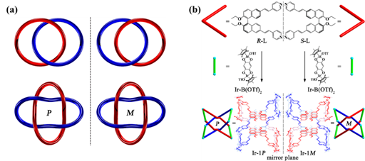 除此之外,Solomon结所具有的拓扑手性也引起了该课题组的关注。对于两个非定向分子环,它们相互穿插互锁一次形成的分子Hopf Links([2]索烃)不具有拓扑手性,而它们双重互锁形成的分子Solomon Link就具有了拓扑手性(有一对拓扑对映体P和M)(如图1-5a)。目前合成的Solomon link的结构大多是一对外消旋体。单一拓扑手性Solomon Links的立体选择性合成仍是一个挑战。研究人员利用轴手性配体R-L和S-L与双核铱化合物Ir-B(OTf)2(长度8.0 Å,大约为2个π-π相互作用的距离)通过配位驱动自组装的方法,分别非对映选择性的得到了分子Solomon Links的拓扑对映异构体P(Ir-1P)和M(Ir-1M)(如图1-5b)。