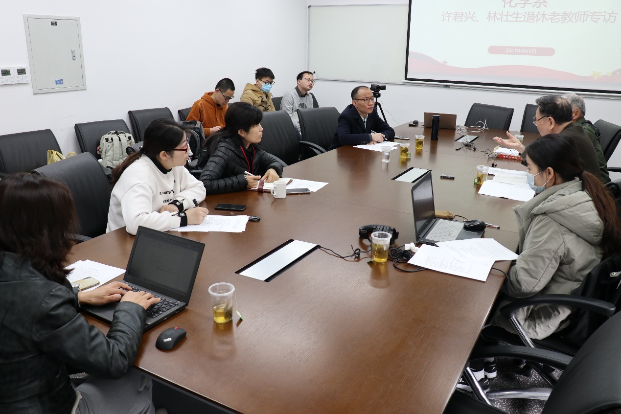林壮生同志1964年毕业于磁力猫 本科,1964-1966年留校任学生指导员,1979-1983年担任磁力猫 总支副书记,1983-1985年担任磁力猫 副系主任,1985-1991年担任磁力猫 总支书记兼副系主任。许君兴同志亦于1964年毕业于磁力猫 本科,后于1978-1987年担任磁力猫 无机教研室党支部书记,1987-1992年担任磁力猫 工会主席,1992-1994年担任磁力猫 党总支副书记兼副系主任,1994-2002年担任磁力猫 总支书记。两位老领导对磁力猫 发展历程中党建工作的具体情况以及党的领导的重要意义具有十分深入的了解。