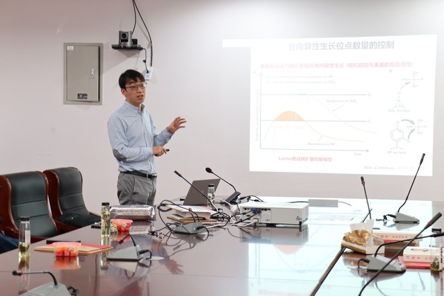 青年研究员李晓民作了题为“纳米药物载体与输运”的主题报告。他从纳米药物载体与生物主体间的相互作用对纳米药物设计的重要性出发,根据纳米药物载体在递送中的矛盾需求,详细介绍了课题组团队在非对称材料的合成与设计以及在药物负载与控释方面的应用。