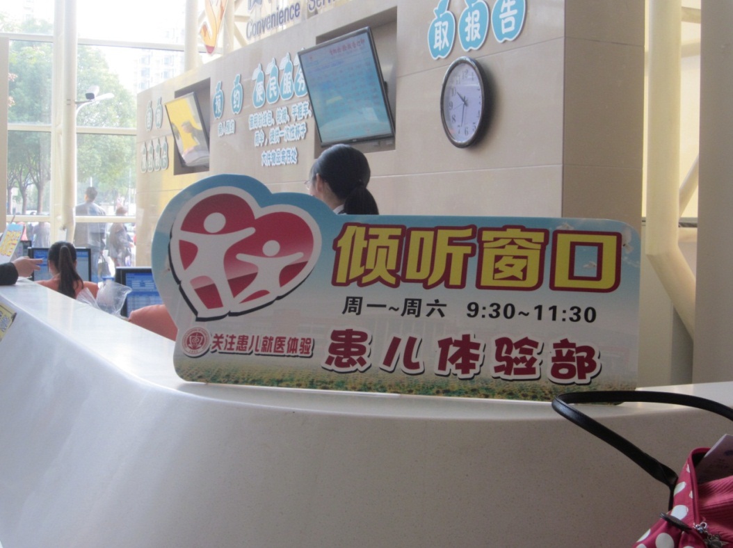 门诊大厅设立“倾听窗口”,由医院各个职能科室及院领导轮流值班,每天三小时,倾听患儿及家属的心声,并及时解决问题。