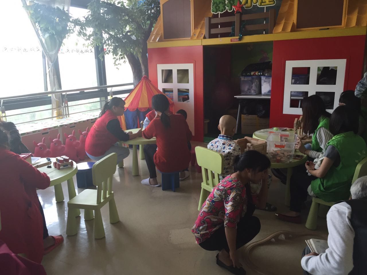 爱心小屋里,党员志愿者正在指导小患儿搭积木、做游戏。