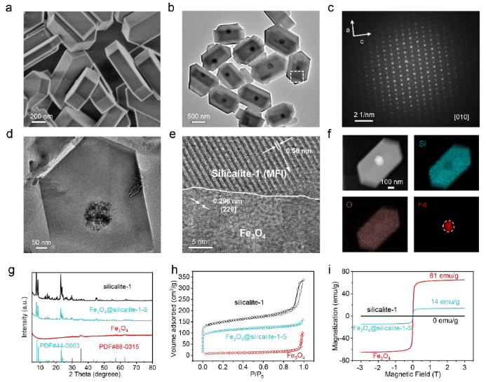 将功能性胶体纳米颗粒(100 nm)封装到单晶ZSM-5分子筛中,旨在构建均匀的核-壳结构,由于显著的晶格不匹配和独特的结晶,使得面临着巨大的挑战。基于此,磁力猫 赵东元院士和李伟教授、上海石油化工研究院杨为民院士(共同通讯作者)等人报道了一种核-壳结构的单晶分子筛,其中包含一个Fe3O4胶体核心,通过一种新的限制逐步结晶方法制备。所得单晶ZSM-5分子筛具有完美的单晶结构,尺寸均匀,为800×600×400 nm,磁性Fe3O4核直径约为150 nm。该材料具有优异的孔隙率,具有365 m2/g的高表面积和14 emu/g的高磁化强度。该方法包括将分子筛种子精确植入Fe3O4核表面,然后进行密闭分子筛生长和单晶ZSM-5分子筛的孵育。
