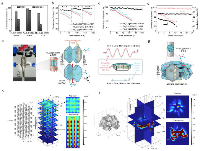 磁性稳定床反应器中的高效催化性能:所开发的磁性核单晶沸石材料在磁性稳定床(MSB)反应器中展现出卓越的催化性能,特别是在乙醇脱水制备乙烯的反应中,实现了98%的转化率和98%的乙烯选择性,同时具备超过100小时的催化稳定性。这一成果不仅展示了新材料在工业催化过程中的潜力,也为改进传统催化反应器技术提供了新思路。