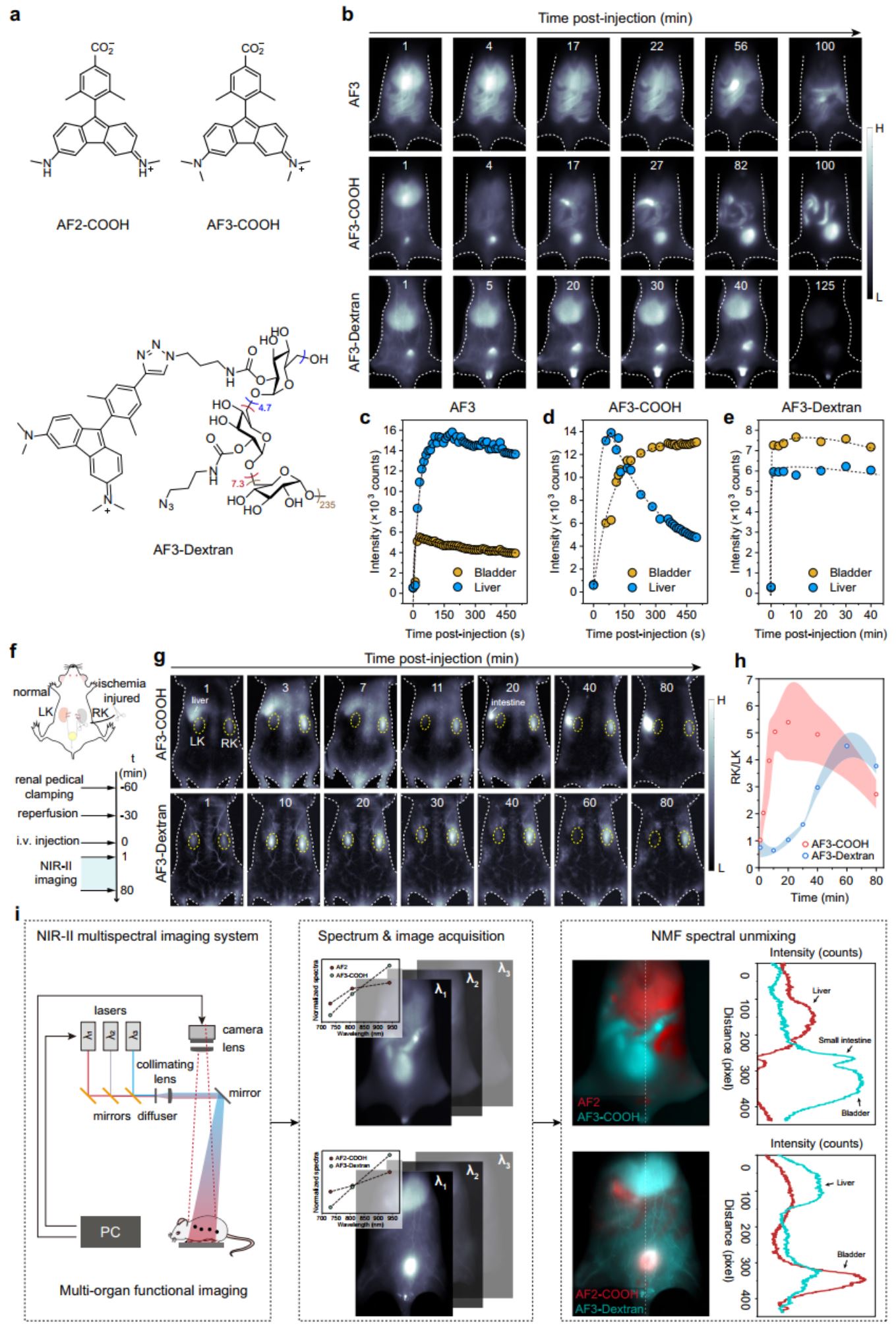 图1. (a) 几种AF染料衍生物的化学结构;(b) AF染料和衍生物的活体NIR-II荧光成像情况;(c-e) 染料在各时间点在肝脏和肾脏中的定量荧光信号分布情况;(f,g) 染料的单侧肾脏缺血再灌注过程示意图和活体内NIR-II成像情况;(h) 图g中两侧肾脏荧光强度比值随时间的变化过程;(i) 活体NIR-II多光谱荧光成像工作流程示意图。