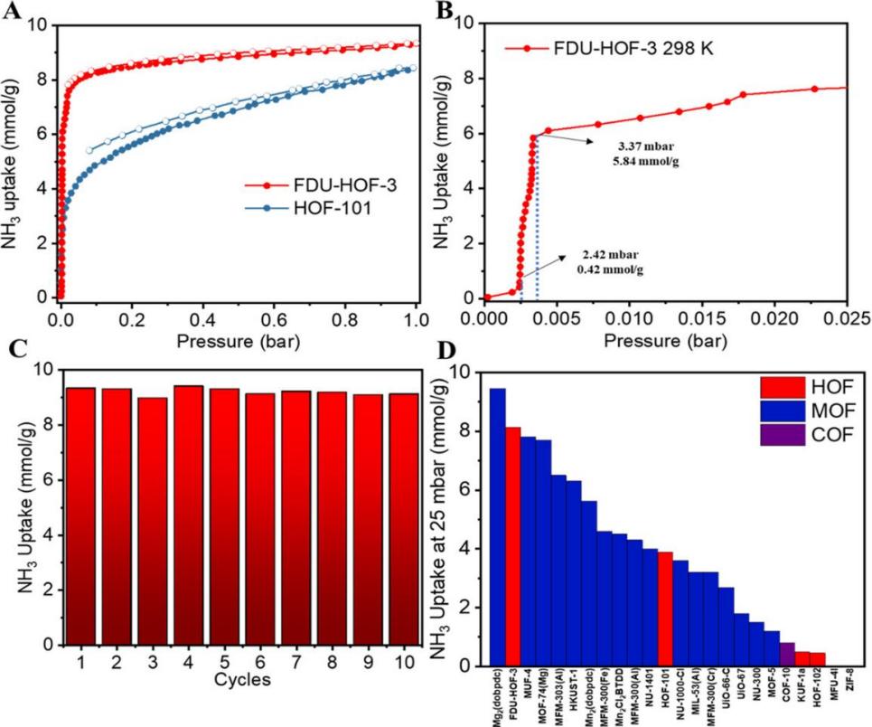 在1 bar的压力下,HOF-101的氨气吸附容量(8.44 mmol/g)与FDU-HOF-3的氨气吸附容量(9.34 mmol/g)相当(图2A),在3.37 mbar下,FDU-HOF-3的氨气吸附容量达到5.84 mmol/g,高于HOF-101(2.26 mmol/g)。HOF-101和FDU-HOF-3的孔径大小不同,导致其捕获氨气的性能也有很大差异。重点观察FDU-HOF-3的低分压区域(图2B),在2.42和3.37 mbar处分别观察到两个拐点。在第一个拐点之前,氨气吸附量增长缓慢的主要原因是,氨气只是简单地填充了孔隙。当分压达到 2.42 mbar时,氨气迅速开始与羧酸基团相互作用,导致氨气吸附量急剧增加。当分压达到3.37 mbar后,大部分羧酸基团被氨气侵蚀,氨气吸附的主要驱动力变成了 氨气分子与孔隙之间的相互作用。在25 mbar条件下,FDU-HOF-3的氨气吸附量达到 8.13 mmol/g,优于其他多孔材料,如 MFU-4(7.8 mmol/g)、MOF-74(Mg)(7.7 mmol/g)、HKUST-1(6.3 mmol/g)、MFM-300(Cr)(3.2 mmol/g)和COF-10(0.8 mmol/g)。在所有 HOF 中,FDU-HOF-3在25 mbar条件下对氨气的吸附容量最大。氨气在FDU-HOF-3的吸附热达到69.29 kJ/mmol,主要归因于氨气分子与羧酸基团之间的化学作用。同时其在10轮氨气循环吸附-解吸过程中保持稳定的吸附容量(图2C)。