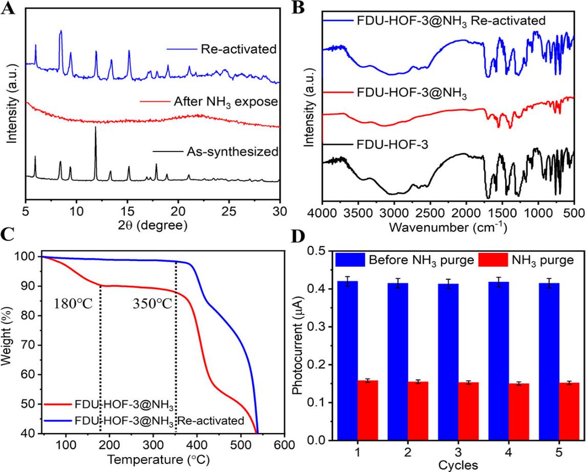 为了进一步研究氨气在FDU-HOF-3和HOF-101中的吸附行为,我们分析了吸附和去除氨气后HOF的粉末X射线衍射数据。当氨气进入HOF时,FDU-HOF-3和 HOF-101失去了结晶状态(图 3A)。通过加热和脱气再生到初始晶体结构后,再生的HOF获得了结晶性。脱气温度随时间的变化表明,室温不足以使 FDU-HOF-3 完全恢复到初始晶相,需要热源来诱导自修复过程。傅立叶变换红外光谱分析显示(图 3B),在引入氨气分子后,COOH中C=O的特征峰(1700 cm-1)消失了,而COO-的特征峰则出现在1560和1400 cm-1,这表明COO-和 NH4+得出现。DFT计算发现,NH4+比氨气更容易与羧酸结合。计算得出的NH4+与COO-的结合能为-57 kJ/mol,比氨气与羧酸的结合能高15 kJ/mol。在吸附和去除氨气的过程中,还对FDU-HOF-3进行了TGA分析(图 3C)。为了评估FDU-HOF-3的气体传感潜力,我们在玻璃碳电极(GCE)上使用抗坏血酸(AA)作为电子供体,测量其光电流响应(图 3D)。FDU-HOF-3在暴露在250 ppm NH3后在10秒内光电流显著下降,这使得它有望用于光电化学传感应用。
