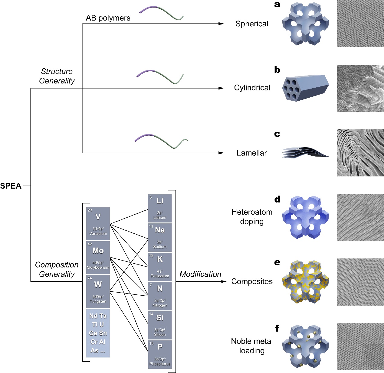 该组装体系适用于所有水溶性多酸团簇的组装,并不受两亲性嵌段共聚物种类的影响。此外,多酸团簇的平衡阳离子(如铵根离子和碱金属离子)也参与到了组装结构中。通过煅烧转化,可以构建不同杂原子掺杂或碱金属离子嵌层的有序介孔金属氧化物。