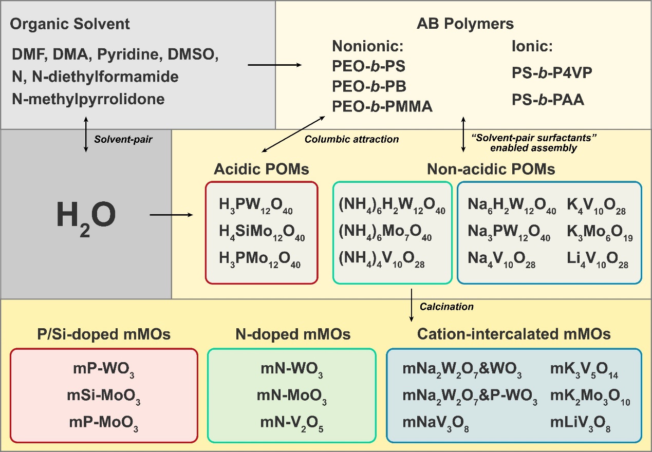 磁力猫 邓勇辉教授团队首次提出了一种“溶剂分子对”表面活性(Solvent Pair Surfactant)概念,发现某些溶剂对(如DMF/H2O)能够像表面活性剂那样介导并促进亲水组装单元与两亲性嵌段共聚物之间的组装。基于该发现,研究团队实现了两亲性嵌段共聚物与多金属氧酸盐团簇通过“溶剂对”介导的非直接相互作用共组装,通过高温煅烧处理所得到的有机-无机复合组装体,创制了具备不同组分和结构的介孔金属氧化物材料库,包括杂原子掺杂(如N-WO3, P-WO3, Si-MoO3, P-MoO3, N-MoO3, N-V2O5)和碱金属离子嵌层(如Na2W2O7&WO3, Na2W2O7&P-WO3, K2Mo3O8, NaV3O8, K3V5O14, LiV3O8)的有序介孔金属氧化物。这种新型组装合成体系不易受到外界环境影响,对合成条件具备极高容忍度,易于对最终材料的组分和结构进行裁剪和修饰。相关工作以“Solvent-Pair Surfactants Enabled Assembly of Clusters and Copolymers towards Programmed Mesoporous Metal Oxides”为题发表在Nature Communications上,文章第一作者是磁力猫 博士研究生谢文鹤。