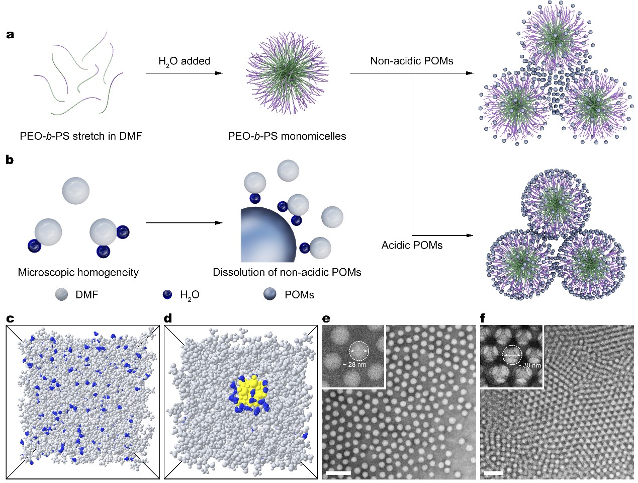 在以有机溶剂为主导的微观均质的二元溶剂中(如DMF/H2O),分子尺度互溶的DMF和水分子由于存在较强的相互作用,形成动态稳定的DMF·nH2O聚集体。当向该体系中加入溶于水但不溶于有机溶剂的非质子型多酸团簇(以铵根或碱金属离子为平衡阳离子)时,DMF·nH2O展现出类似表面活性剂的性质,其中H2O端朝向并包裹着多酸,DMF端与外界溶剂环境(即连续相)接触,使多酸团簇稳定溶解。在溶剂挥发过程中,尽管非质子型多酸和聚合物之前没有明显的特异性相互作用,DMF·nH2O却可以作为信使将多酸团簇带往嵌段共聚物胶束的亲水端(如PEO区)选择性聚集,形成有序结构。该研究论文系统研究了不同二元溶剂体系中的聚合物-团簇共组装行为,通过电镜表征、核磁氢谱、分子动力学模拟、密度泛函理论计算等手段深入揭示了组装过程,阐明了二元溶剂微观均质性对该组装体系的重要性。