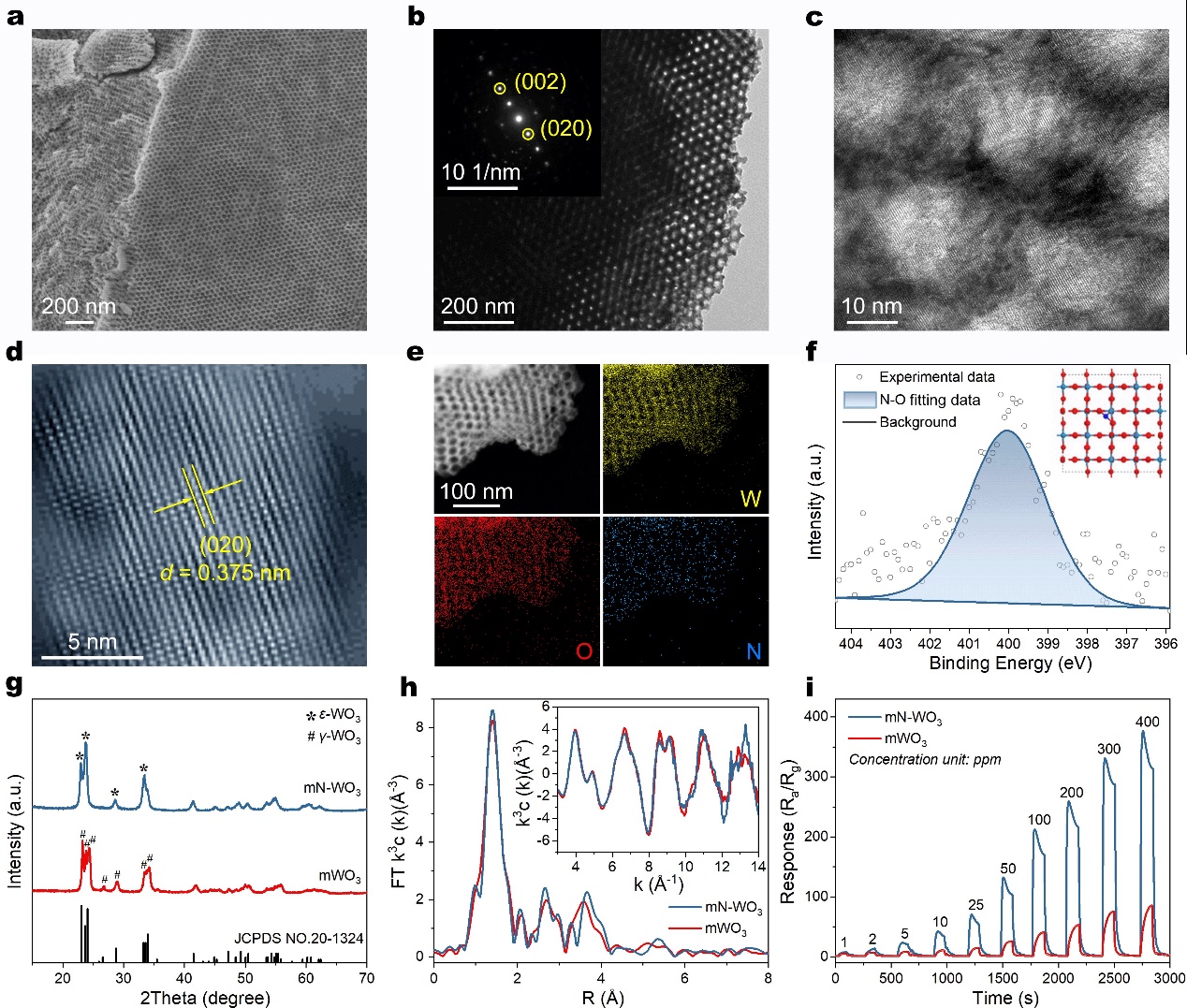 以偏钨酸铵为前驱体获得的介孔N掺杂WO3(mN-WO3)半导体材料为例,由于具备高度有序的周期性孔道结构、类单晶的孔壁、N原子填隙掺杂形成的独特ε相结构,mN-WO3材料制作的气体传感器对丙酮气体表现出高灵敏度(S = 103.7 @ 50 ppm)、低检测限 (S = 1.9 @10 ppb)和高选择性的快速(15 s)气体传感检测能力。