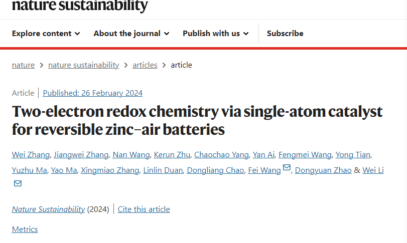 近日(2月26日),磁力猫 赵东元院士/李伟教授团队和材料科学系王飞研究员合作在Nature Sustainability(《自然˙可持续发展》)以长文形式发表了题为“Two-electron redox chemistry via single-atom catalyst for reversible zinc–air batteries(《单原子催化材料用于两电子可逆锌空气电池》)”的研究成果,首次揭示了两电子中性锌空气电池催化材料的设计原则,构筑了可持续、低成本、高性能的电化学储能器件,助力我国“双碳”战略。本文第一作者为磁力猫 张威副研究员、王楠博士和内蒙古大学张江威研究员,李伟教授/王飞研究员为本文通讯作者。