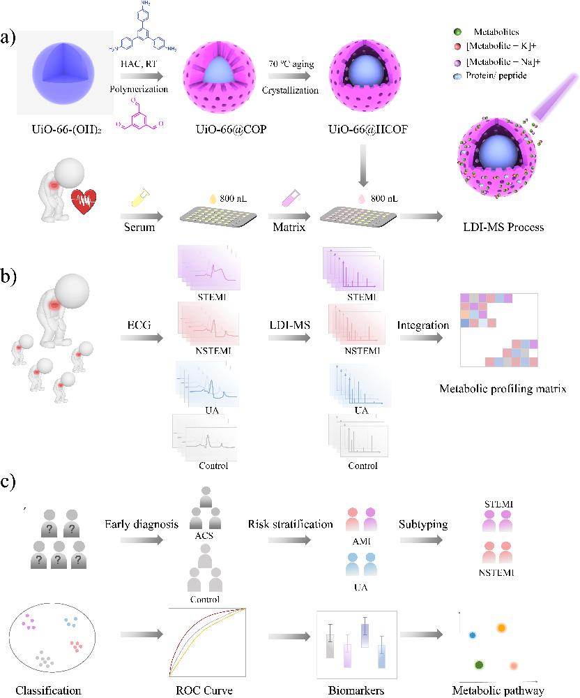 图1 搭建的UiO-66@HCOF辅助的LDI-MS平台用于ACS的早期诊断和风险分层。