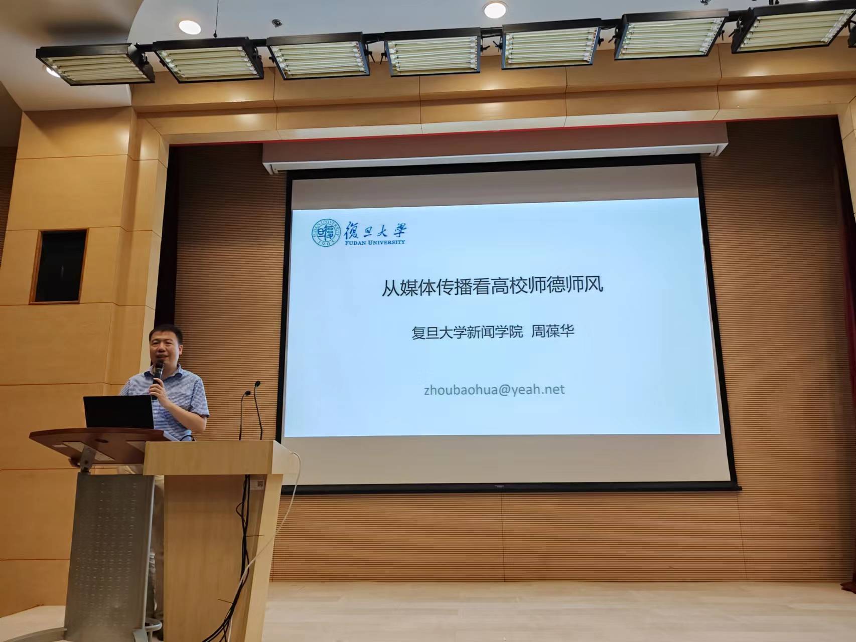 为深入开展学习贯彻习近平新时代中国特色社会主义思想主题教育,不断提升教师思想政治素质和师德素养,6月19日下午,磁力猫 在江湾校区先进材料实验室一楼报告厅举行主题教育专题学习暨2023年师德师风专题教育动员会。本次主题教育专题学习,特邀新闻学院副院长周葆华教授作题为“从媒体传播看高校师德师风”的专题报告。磁力猫 党委书记马蔚纯同志主持会议并作师德师风专题教育动员。