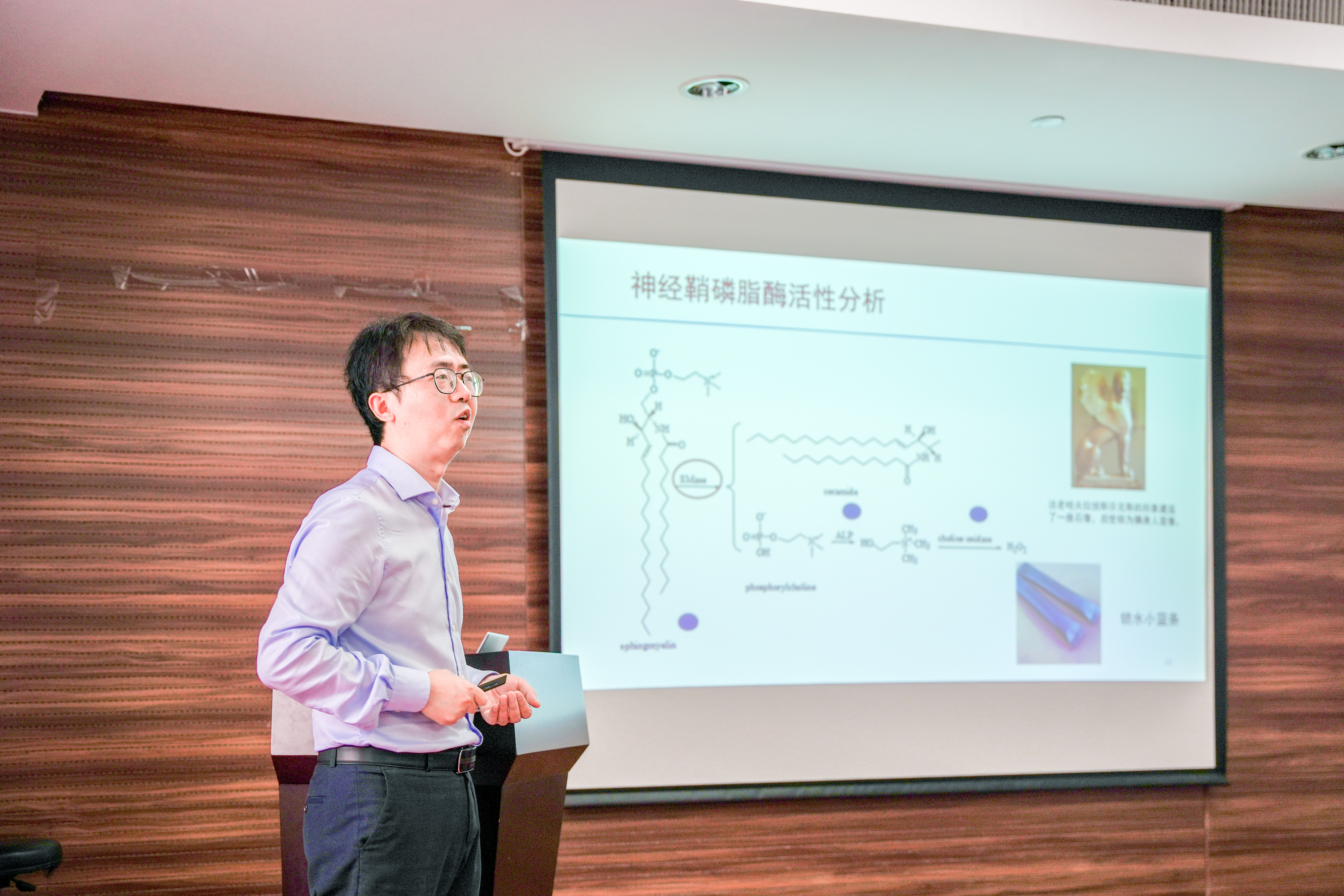 江德臣教授致力于发展新型电化学方法与装置,实现通用型的单细胞和亚细胞分析,为单细胞异质性提供研究工具和科学数据。在报告中,江教授从单细胞活性测量、电化学发光高通量分析、超分辨电化学成像三个方面进行了分享。目前的单细胞分析侧重于单个活细胞中生物分子含量的检测,而较少涉及酶分子活性的定量测定。江教授提出了通过电化学方法探测酶活性,采取了“单细胞试剂盒”的解决策略,逐步实现了单个细胞内酶活性、单个细胞器酶活性,乃至单个分子活性的分析。该方法有望在单细胞生物分析及临床应用中发挥巨大作用。高通量测量并统计分析单个细胞在生理/病理过程中生物分子的含量变化,对于精准理解生命过程的化学基础及疾病的早期诊断至关重要。江教授利用电信号到光信号的转变,提出并建立了单细胞试剂盒的电化学发光方法。该方法实现了临床组织切片酶谱的呈现,提供了新的快速病理分析手段。另外,江教授课题组还致力于电化学成像超分辨分析,研发的仪器实现了单个分子电化学成像。该方法能够通过离子电流的改变解析细胞表面蛋白的三维分布,监测蛋白分子聚集分散过程。江教授的报告深入浅出,引起了师生的极大兴趣,报告会现场交流热烈,学术氛围浓郁。