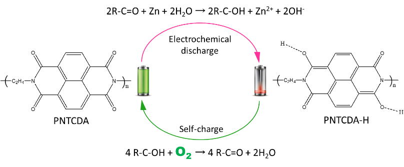 在该研究中,设计的可植入盐水电池的正极为聚1,4,5,8-萘四甲酸酐(PNTCDA,一种聚酰亚胺,生物兼容性好),负极为锌金属。放电过程中,含有碳基的PNTCDA被还原为酚羟基化合物PNTCDA-H;PNTCDA-H容易被氧化回PNTCDA,同时氧气被还原,该过程即为正极的化学自充电过程(图2)。在氧气的参与下,上述过程形成放电/自充电循环。由于PNTCDA在电化学还原/化学氧化循环过程中不会破坏有机物骨架,因此稳定性高,可以达到持续耗氧(持续耗氧时间>500 h)的作用。
