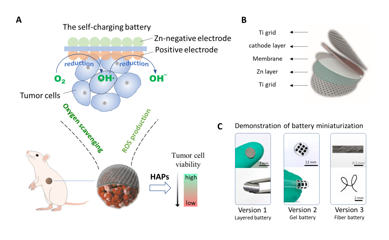 乏氧可作为乏氧激活前药的靶点,然而实体瘤中的乏氧分布不均匀且程度不足,是乏氧激活药物III期临床研究失败的主要因素之一。考虑到氧气在电池正负极反应中的重要作用,磁力猫 夏永姚教授团队、张凡教授团队合作设计了可植入的自充电盐水电池用于肿瘤微环境的长效乏氧调控和抗肿瘤研究(图1)。
