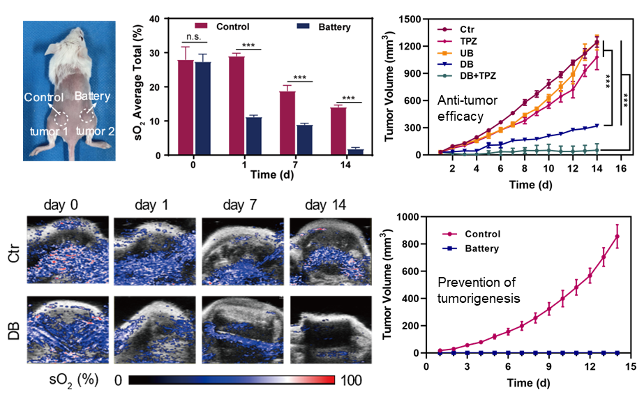 图3. 自充电盐水电池维持肿瘤长期缺氧以增效抗肿瘤治疗