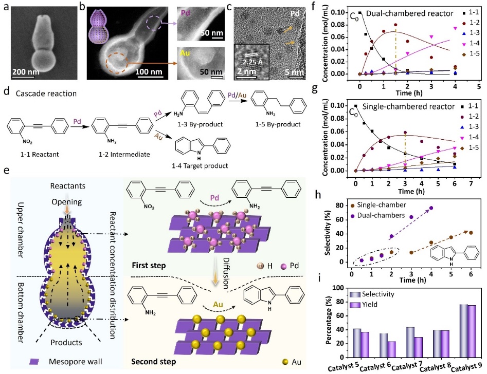 基于此,磁力猫 赵东元院士、李晓民教授团队通过一种纳米液滴的分步重塑策略合成了具有可调腔室数量(由1个到3个)和腔室分布的多腔介孔纳米颗粒。通过原位的分步共组装进一步在单颗粒水平实现了多功能(磁性、催化、光学等)实体的分离和配位构建。此外,通过在双腔开口葫芦的上腔植入Pd纳米晶,在底腔锚定Au纳米颗粒设计了具有空间分离双活性位的双腔纳米反应器。在级联反应合成2-苯基吲哚方面表现出良好的催化性能,选择性高达76.5%,是单腔室纳米反应器(约41.3%)的1.85倍。