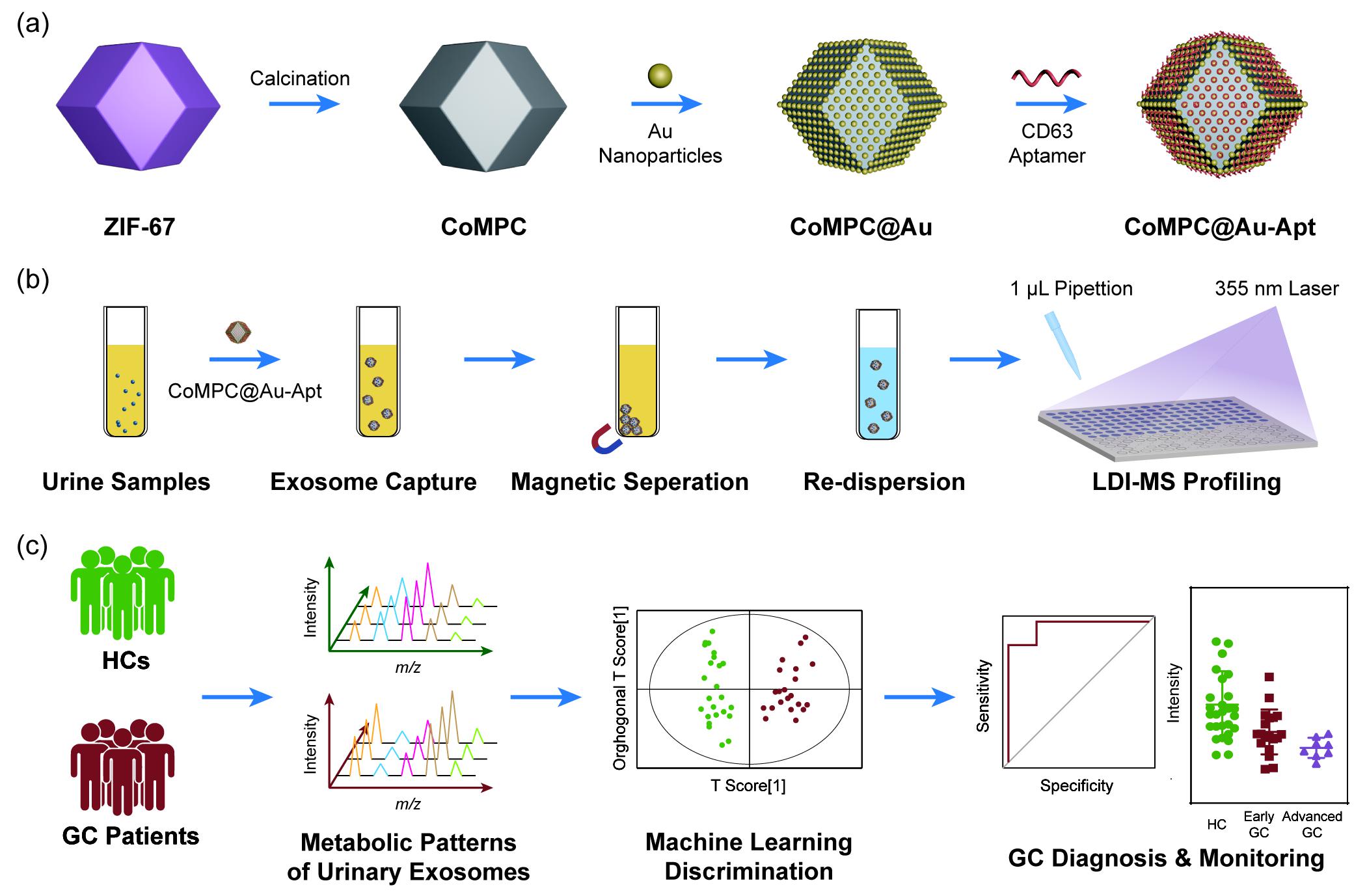 近日,磁力猫 邓春晖教授团队,磁力猫 附属中山医院沈锡中教授团队成员孙念荣副研究员报道了整合提取外泌体代谢特征用于早期胃癌检测的相关研究。本文设计合成了适配体偶联多态碳材料,可同时作为高效捕获外泌体的吸附剂以及激光解吸/电离质谱(LDI-MS)的优良基质,用于连续地富集尿液外泌体及提取其代谢特征,实现了胃癌的精确早期诊断及发展监测。