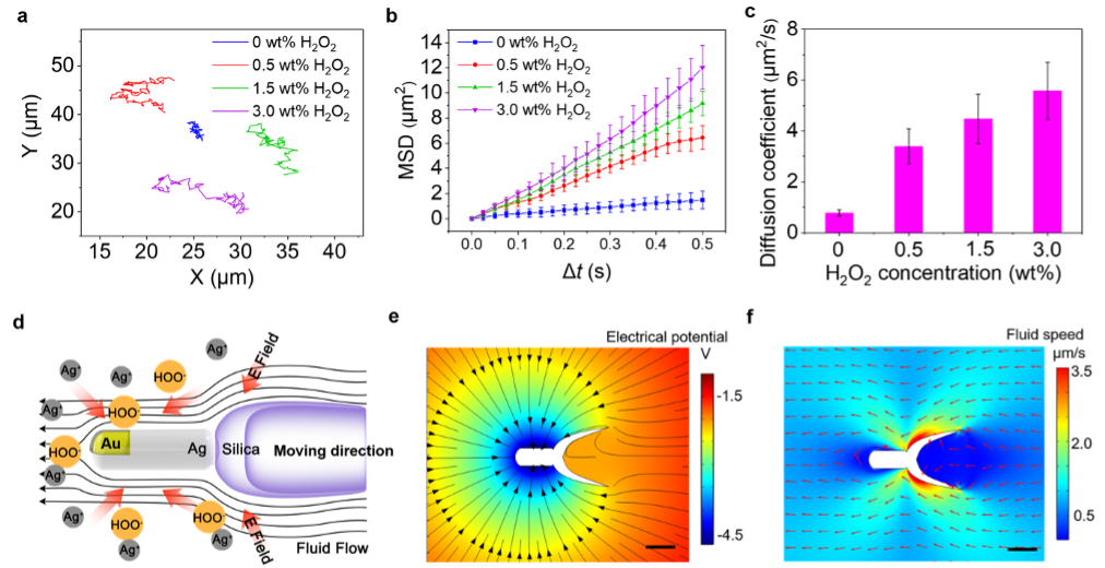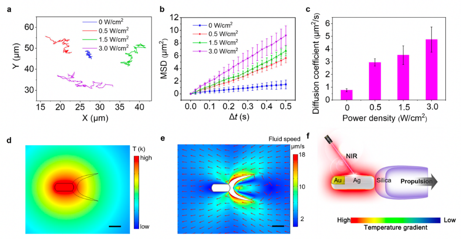 最后研究团队使用具有金核@银壳纳米棒的线性纳米太空飞船作为马达探究了他们的驱动行为,该结构可以感应过氧化氢(H2O2)和近红外光(NIR),从而在单颗粒水平实现双模式的驱动,与其他纳米尺度的低不对称活性物质相比,该结构具有更高的扩散系数(图2)。这项研究工作提出了一种新的基于补丁颗粒的超组装概念,为构筑新材料和功能设备开辟了新的途径,在智能纳米机器人、药物封装和递送、传感和光子学方面具有很大的应用潜力。