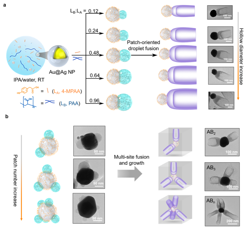 图1.软界面导向的超组装策略:a)软补丁界面导向的液滴方向性的融合制备空腔可控的金@银-二氧化硅纳米太空飞船;b)通过控制补丁数目来控制纳米空舱的数目。