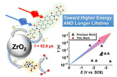 近日,磁力猫 胡可课题组与北卡罗来纳大学教堂山分校Gerald Meyer教授合作,将PDI光敏剂通过水杨酸基团锚定在介孔纳米晶二氧化锆(ZrO2)(常被看作绝缘体)表面,可见光激发下,2(PDI•–)*的高能电子注入ZrO2导带中,形成的电荷分离态ZrO2(e–)|PDI使高能电子的寿命延长至~53 μs。相比PDI•–的激发态寿命,提升了近6个数量级。