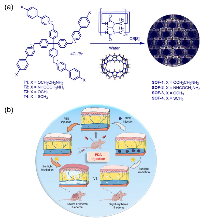 针对以上问题,黎占亭团队构筑了孔径大小为2.1 nm的三维超分子有机框架材料(SOF),并通过PDT后注射SOF的方式来清除残余的临床上使用的三种卟啉类光敏剂卟吩姆钠、海姆泊芬和他拉泊芬钠。荧光滴定和动态光散射实验证实 SOF与 PDA有很强的相互作用,而透析实验表明SOF对PDA的吸附具有明显的保留效应。细胞毒性、溶血实验和大鼠耐受实验(MTD)表明,SOFs 具有很高的生物相容性,其中一种SOF的MTD高达77 mg/kg。健康裸鼠和大鼠模型、以及荷瘤裸鼠模型研究表明,当 PDA 以与临床剂量相当的剂量给药时,注射SOF可以有效的减轻残余PDA在模拟太阳光照射下出现的光损伤(红斑和水肿),同时对PDA的抗肿瘤活性没有负面影响。这项工作采取PDT后直接注射SOF的策略,极大提高临床使用 PDA 的安全性。构建的减轻PDT后残余PDA光敏作用的方法简单,没有改变PDA的存在形式,符合临床治疗过程,不会影响PDA的抗肿瘤效果,可操作性强。