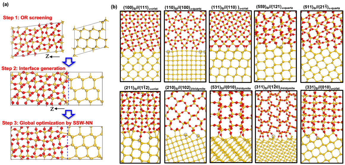 然而,目前的理论和实验方法很难获知精确的Si/SiO2界面原子级别结构。对于实验,界面结构隐藏在材料内部,传统实验方法,比如透射电子显微镜(TEM)很难直接观察。而对于理论计算,界面结构预测缺乏完备和快速的方法,无法考虑各种可能的界面取向,无法精确快速描述界面处的成断键相互作用。