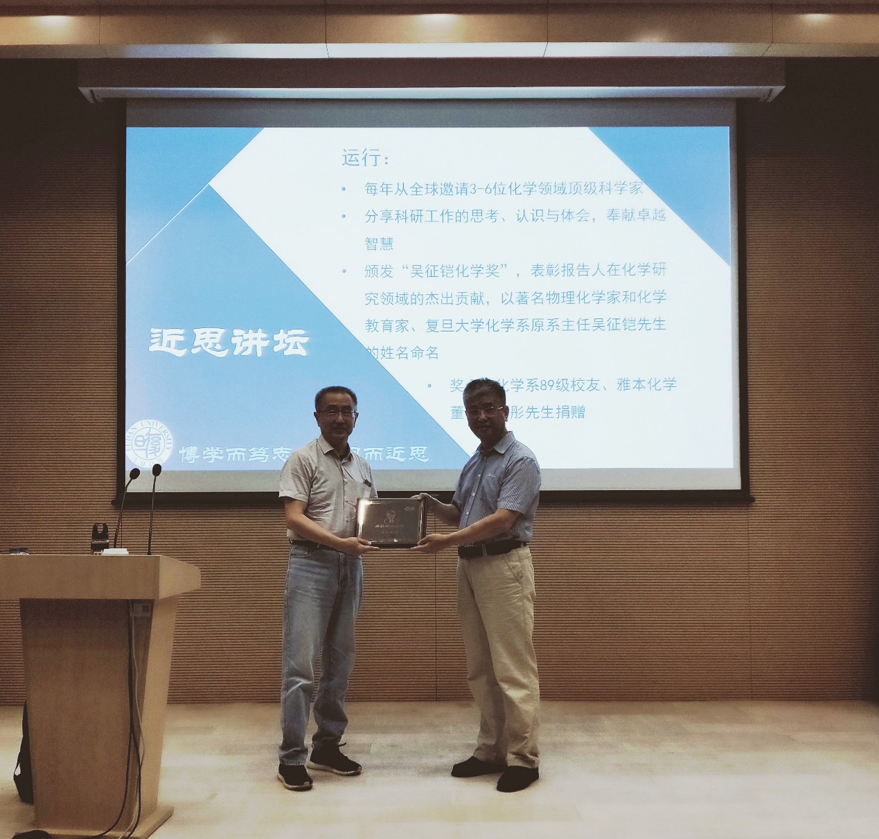 为了表彰吴奇教授在化学科研领域做出的卓越贡献,磁力猫 系主任贺鹤勇教授代表“近思讲坛”组委会向吴奇教授颁发了“吴征铠化学奖”,以此激励与会师生积极探索、努力奋斗,继续推动磁力猫 化学学科向前发展。磁力猫 “近思讲坛”的举办和“吴征铠化学奖”的设立得到了雅本化学Wholly You和磁力猫 1989级系友蔡彤先生的大力支持。