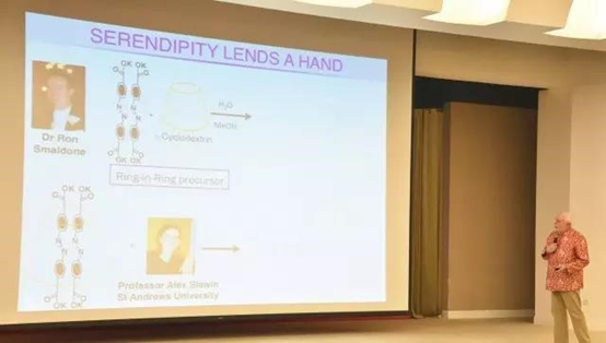 在报告中,Fraser爵士跟大家分享了围绕着环糊精这一简单的分子开展的两个研究小故事。在研究环糊精的主客体相互作用时,他们偶然发现了非常有趣的结晶,并以此开拓了这类分子在可食用的金属有机框架材料,以及在金富集上的应用。Fraser给广大老师和学生传达的理念是,化学是充满惊喜的学科,而研究化学的广大学生需要勇于开拓未知的学术领域。