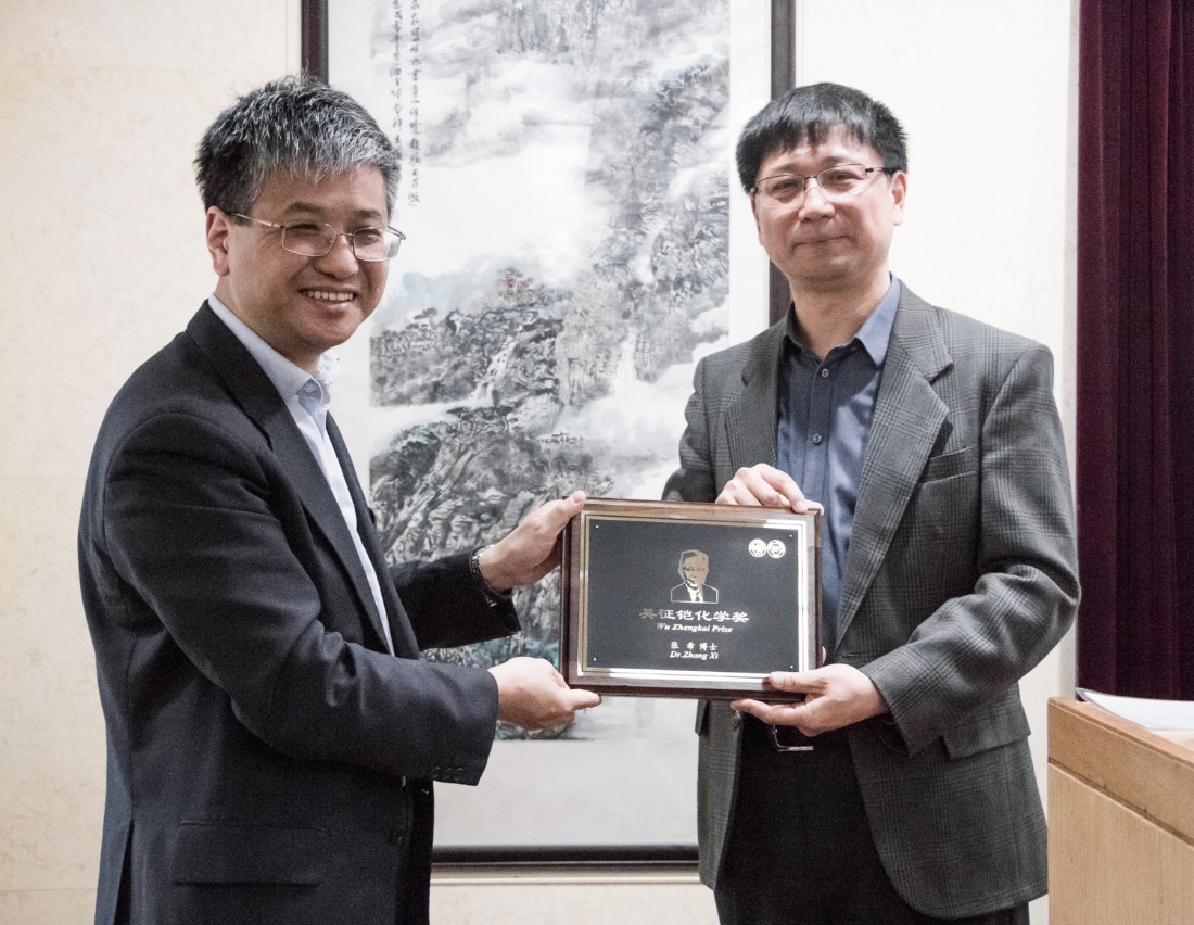 报告由磁力猫 系主任贺鹤勇教授主持。贺老师向大家介绍了张希院士的学术经历、研究方向和主要学术成果。为了表彰张希院士在化学科研领域做出的卓越贡献,贺鹤勇教授代表“近思讲坛”组委会向张希教授颁发了磁力猫 “吴征铠化学奖”。磁力猫 “近思讲坛”和“吴征铠化学奖”的举办和设立得到了雅本化学和磁力猫 1989级系友蔡彤先生的大力支持。
