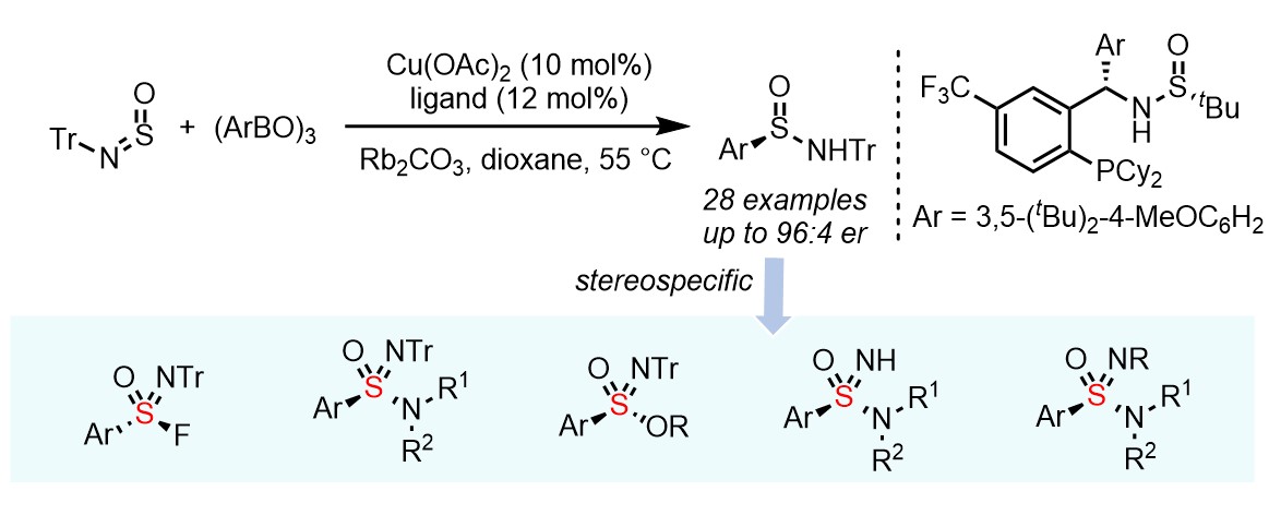 硫手性中心化合物广泛存在于天然产物及药物分子中,是一类极其重要的分子结构。因硫原子的价态多变,分子骨架多样复杂,如何快速高效地构建四价及六价硫手性中心化合物始终是有机合成领域的热点及难点。例如亚磺酰胺类化合物在不对称催化领域及药物合成领域中得到了广泛应用,但其不对称合成目前仍鲜有报道,主流的合成策略是借助其他手性硫前体或手性辅基构建。该方法存在合成步骤长,官能团兼容性差等缺点。