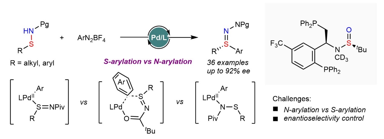 硫手性化合物广泛存在于天然产物及药物分子中,在含有硫立体中心的化合物中,亚砜是最受欢迎和研究最广泛的结构之一。相比之下,它们的氮类似物,硫亚胺,尽管在药物和有机化学中作为临床药物候选者、手性配体和N-自由基前体具有独特的生物和化学性质,受到了越来越多的关注,但却得到了较少的研究。不对称合成硫亚胺,特别是二芳基硫亚胺,仍然是一个具有挑战性且持续的目标,为此,磁力猫 张俊良、杨俊锋课题组开发了一种新型的合成硫亚胺的策略,即通过过渡金属钯与Sadphos配体结合催化来实现次磺酰胺的不对称芳基化从而构建硫亚胺。对于该反应,在配体筛选中发现部分商业配体均未能得到产物,而Sadphos系列配体可以良好的产率及对映选择性得到最终产物,展现了Sadphos强大的催化效果。在底物拓展部分,针对芳基次磺酰胺可以很好的兼容邻间对及给电子、吸电子底物,芳基重氮给电子底物反应效果也较好。此外,多取代、烷基以及杂环的次磺酰胺也能顺利反应。在随后的克级规模制备中可维持产率和对映选择性。在衍生转化中可在构型保持的条件下得到多种六价砜亚胺,证明了其广泛的应用前景。在机理探究中,通过动力学实验和DFT计算证明重氮的氧化加成为速率控制步骤。
