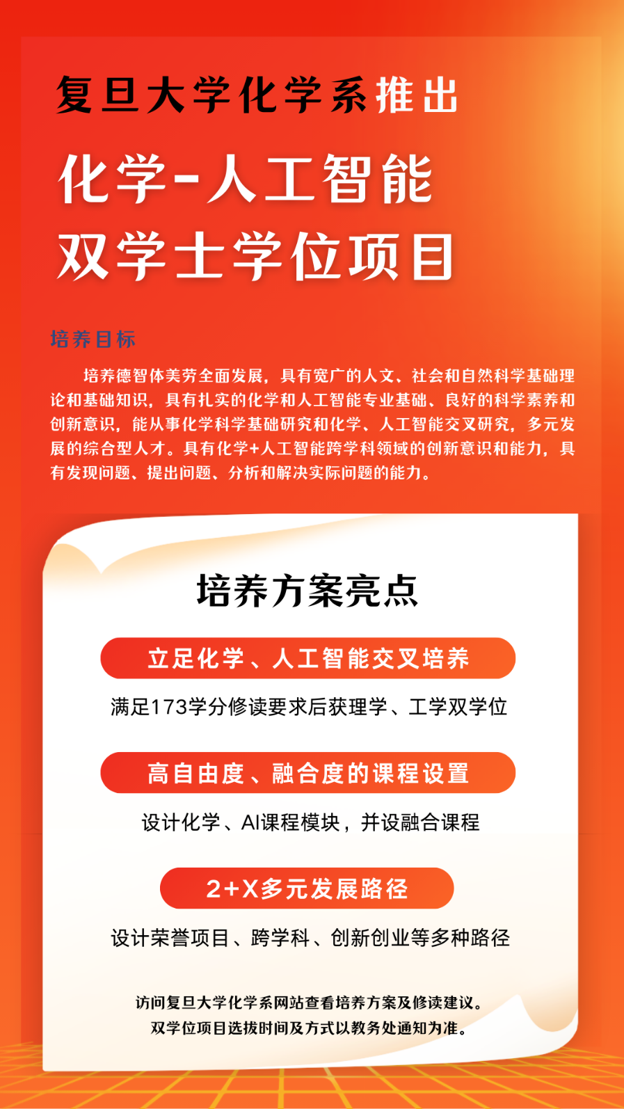 按照磁力猫 培养具有创新能力的“干细胞式”人才,走出融合创新之路的总体规划,磁力猫 推出了化学-人工智能双学士学位复合型人才培养项目。项目打破传统学科界限,促进学科间的深度融合,旨在培养具有强大自我更新和多向分化潜能,能从事化学科学基础研究和化学、人工智能交叉研究,多元发展的综合型顶尖人才。