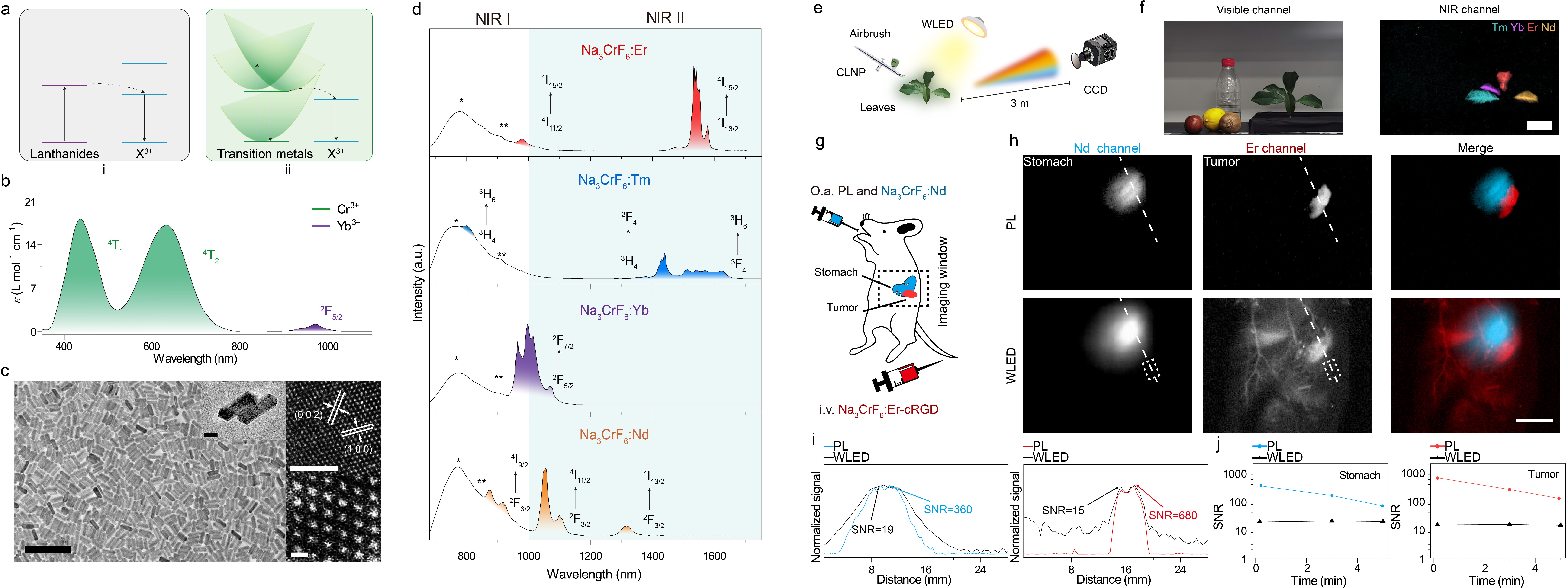 针对以上难题,张凡团队(//nanobiolab.clm1.net/)开发了一系列尺寸均一,结构和发射波长可调的新型过渡金属元素铬敏化的镧系纳米发光颗粒(Cr3+-sensitized lanthanide-doped nanoparticles, CLNPs)。三价铬离子作为人体必需的微量元素,同时具有较高的光吸收截面。其摩尔消光系数是常用的镧系敏化剂的十四倍,使其对激发光具有更强的收集能力。团队首次在纳米尺度实现了过渡金属离子对于六种镧系激活剂的敏化,发光范围覆盖900-1700 nm。此外,与需要激光激发的传统镧系敏化纳米粒子相比,新型的CLNPs在较弱的环境光照射下即可实现高效近红外发光。CLNPs的亮度比相同尺寸的传统镧系敏化纳米粒子最多高出三百七十倍。团队基于CLNPs良好的光学性质,实现了近红外窗口的四色加密和高信噪比的近红外第二窗口多重成像。这一技术的应用极大地简化了近红外成像的使用条件,同时也拓宽了近红外纳米探针的使用范围。