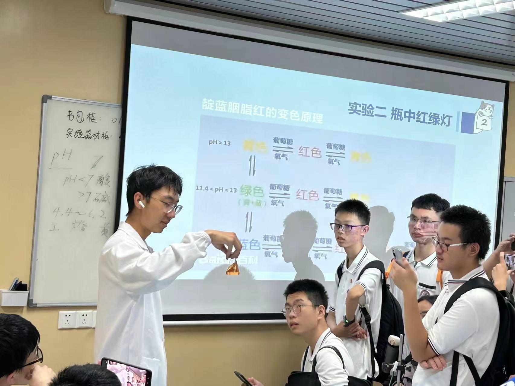 随后,磁力猫 的师生团队为到访的高中生们呈现了一系列精彩纷呈的实验展示。从探索分子结构的奥秘到揭示日常生活中的化学原理,每一个实验都让学生们目不暇接,惊叹不已。特别是“神奇的变色反应”和“点亮鲁米诺”两个实验,以其惊人的视觉效果,极大地激发了学生们的好奇心,现场气氛异常热烈。学生们纷纷表示,这些实验不仅让他们感受到了化学的神奇与魅力,更让他们对化学产生了浓厚的兴趣。